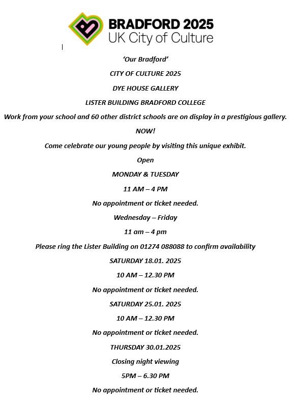The gallery is for Bradford City of culture and houses 2D pieces of artwork based on famous people from Bradford along with 3D work on buildings famous to local areas in Bradford. All the pieces have been made by the 70+ primary schools in the district.
